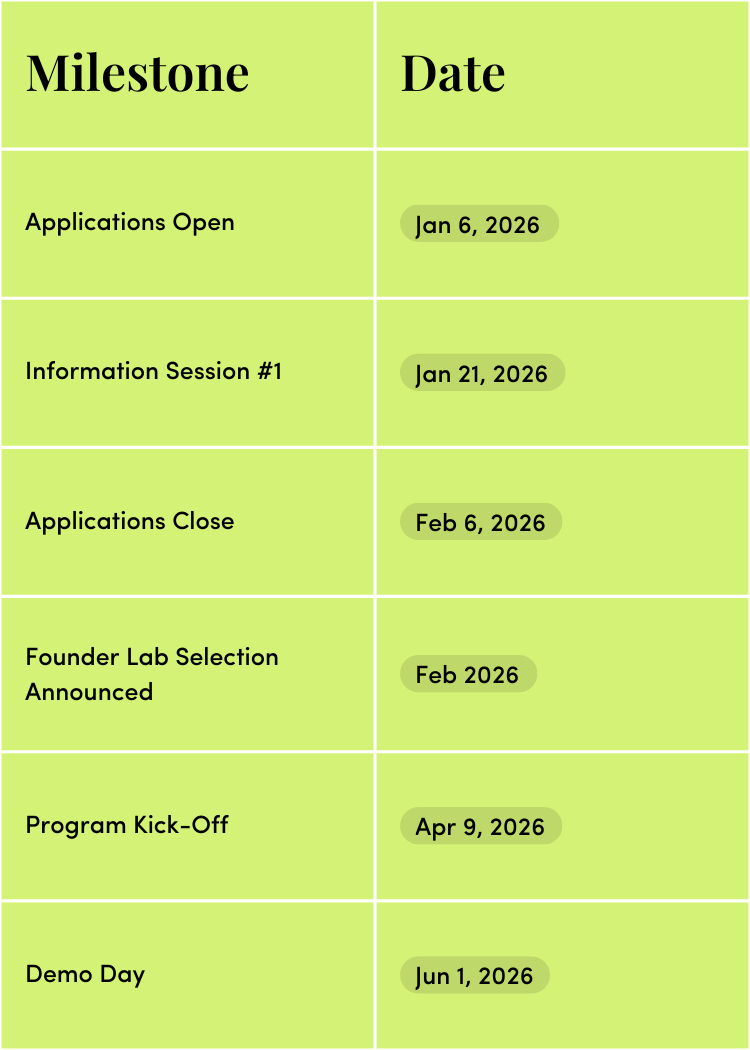 Founder Lab’s Spring 2026 cohort will run as follows: